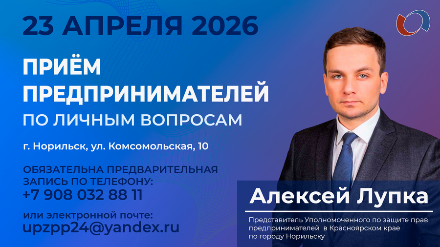 Представитель Уполномоченного по правам предпринимателей Красноярского края в городе Норильске, муниципальный координатор ФПП "Предпринимательство" Алексей Лупка проведет приём предпринимателей по личным вопросам.
